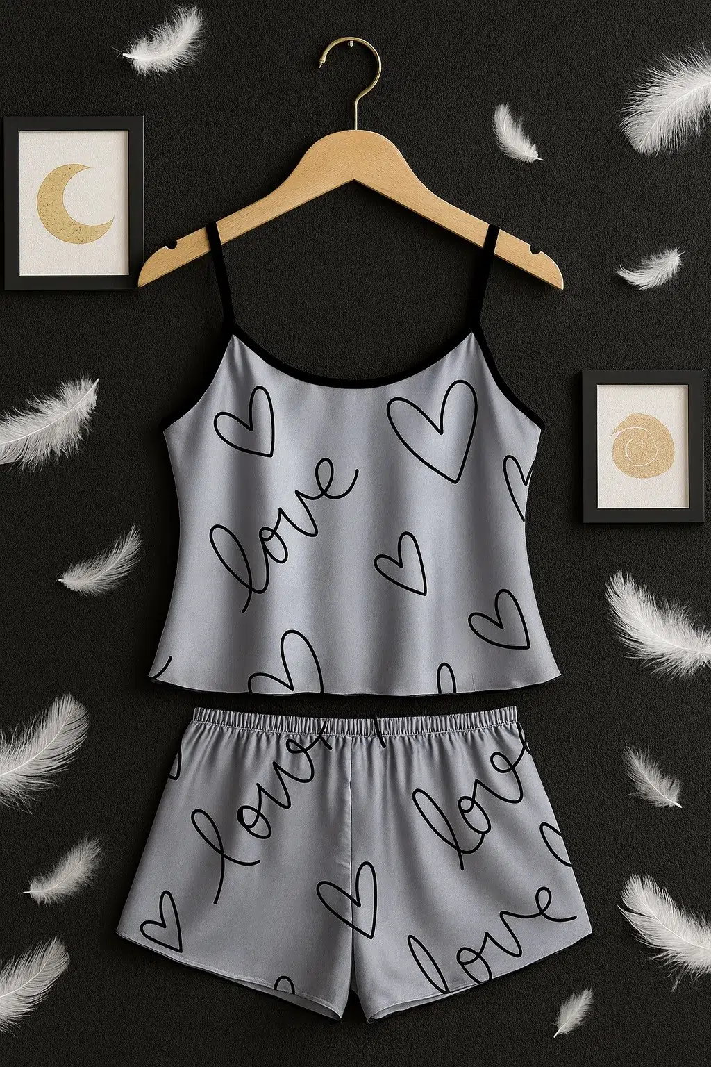 | Etiketler | Gri Love Desenli Saten Şortlu Kadın Gecelik Seti |