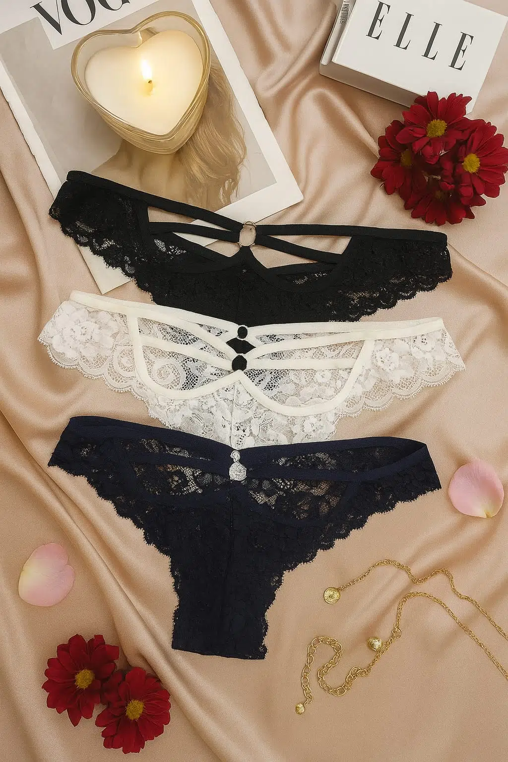 Şıklığın ve zarafetin detaylarda gizli olduğunu bilen kadınlar için tasarlanan bu 3’lü dantel külot seti ile iç giyimde fark yaratın. Siyah, beyaz ve lacivert renklerden oluşan set; ince dantel dokusu, özel kesimi ve zarif taş detaylarıyla estetik bir görünüm sunar. Ön kısmındaki dekoratif şerit ve halka detaylar, ürüne fantezi ve şıklık katarken, esnek yapısı sayesinde vücudu sıkmaz ve gün boyu rahatlık sağlar.