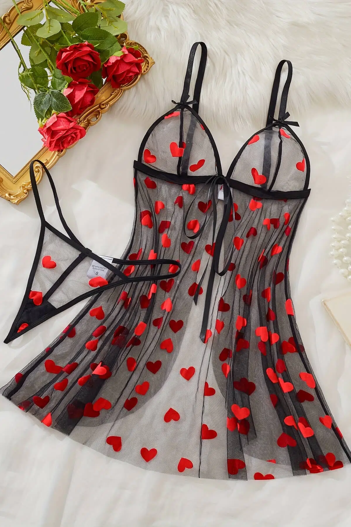EtiketlerKalp Desenli Siyah Transparan Gecelik TM1378