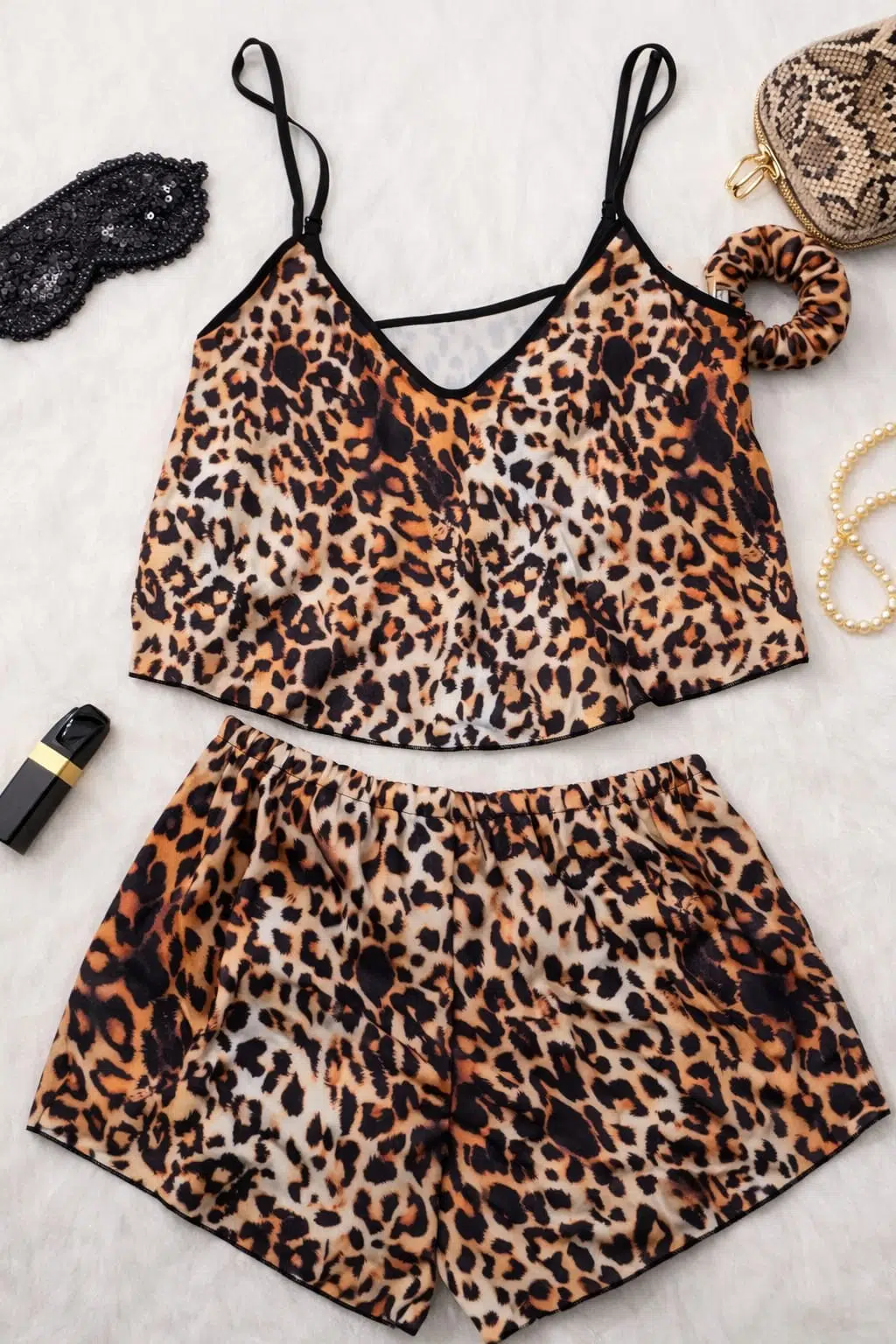 Cesur leopar deseniyle modern ve enerjik bir stil sunan bu büstiyer & şort pijama takımı, ev giyimine iddialı bir dokunuş katıyor.