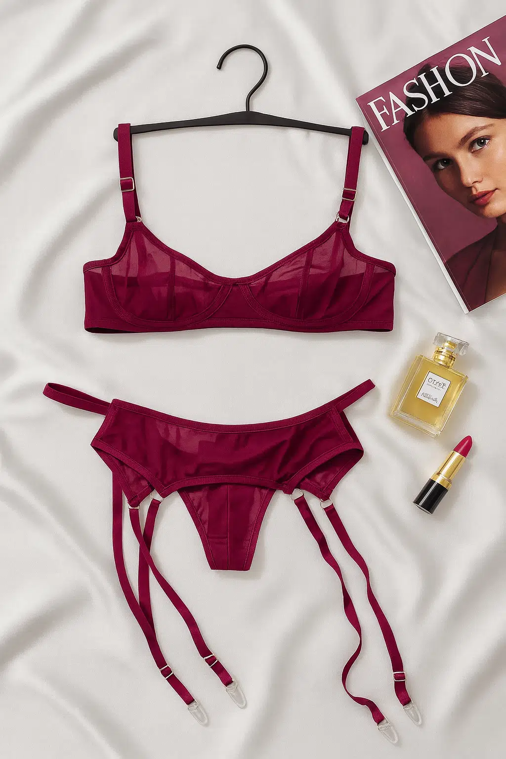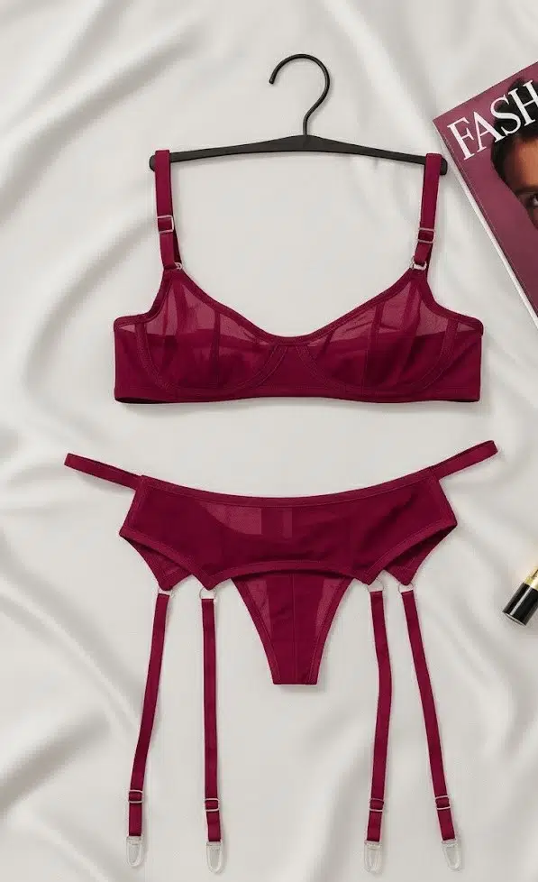 Kendinizi şık, özgüvenli ve benzersiz hissetmek istediğiniz tüm anlar için tasarlanan bu bordo jartiyerli iç giyim takımı; modern çizgisi, transparan detayları ve kusursuz duruşu ile stilinizi bir üst seviyeye taşıyor.